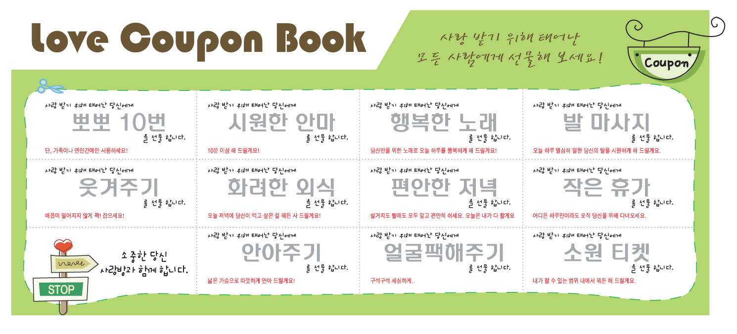 생일 며칠전 받고 싶은 사람한테 받고 싶은 티켓 하나씩..건네주고~~~ 생일 되기 일주일안에 해달라고 하면.... 좋겠네요~~~~~ ^^