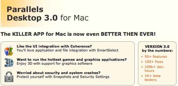 Parallels의 새로운 버전 3.0이 발표되었다. 이번 버전의 가장 중요한 특징은 드디어 3D게임 지원이다.