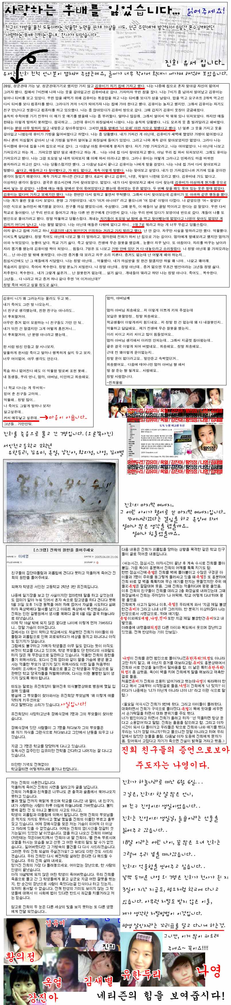 음..현실이 안타까울 따름입니다. 솔직히 저도 이런글은 별로 보고 싶지 않죠..왠만하면 즐거움만 느끼고 싶으니까요.. 이런글을 올리지 말라했던분도 좋은 뜻이지 나쁜 뜻은 없었을지도.. 그런데 요즘 들어 이런 일들이 많이 나돌다 보니.. 가끔은 두렵기도 하더군요.. 만약에 위에 있는 학생중에 비관해서 자살하는 사람이 나온다면 누구의 잘못이 될지...  대가를 받은 것일까요......아님 올린사람의 잘못일까요?....과연...