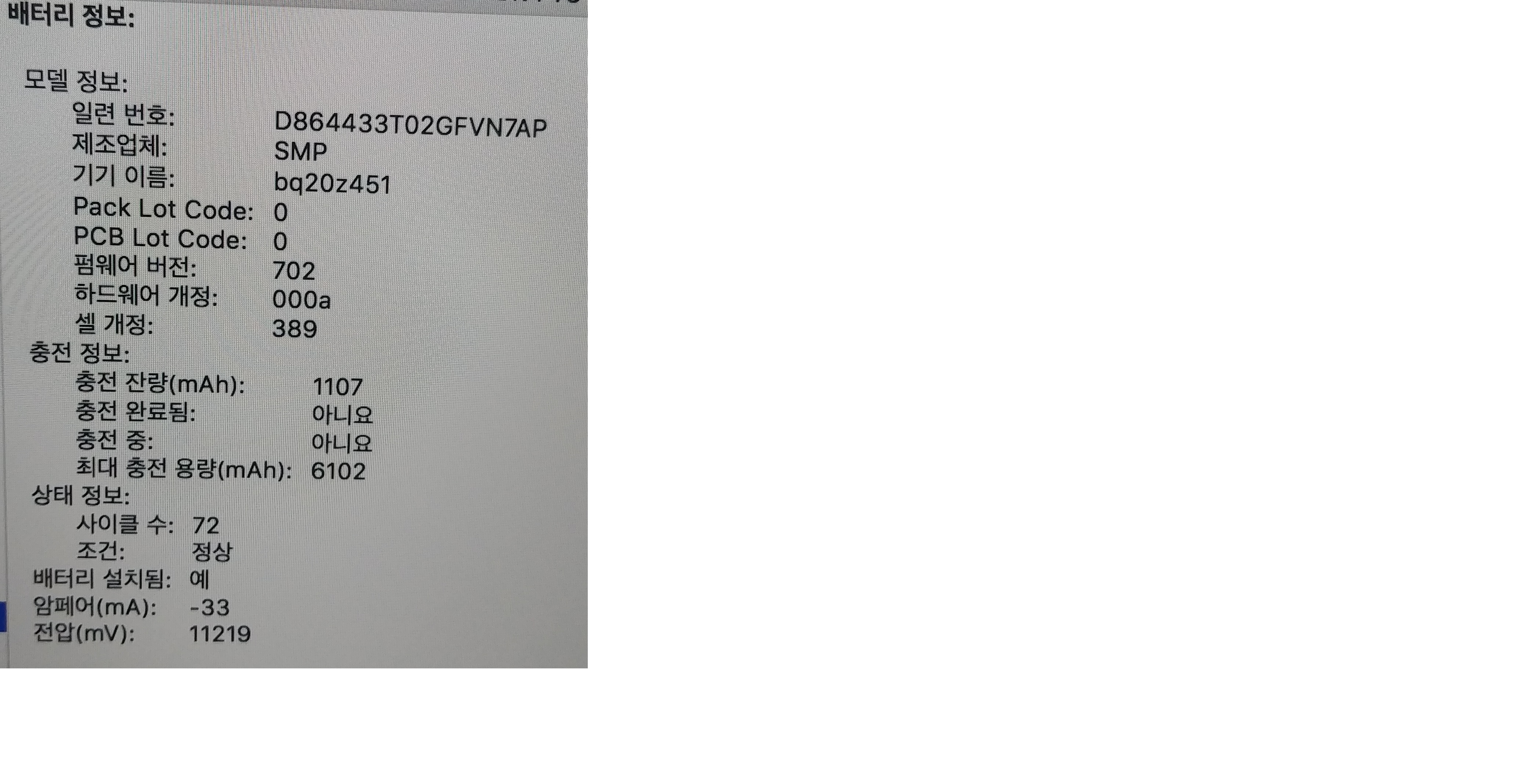배터리 사이클 72  최대충전용량 6102
