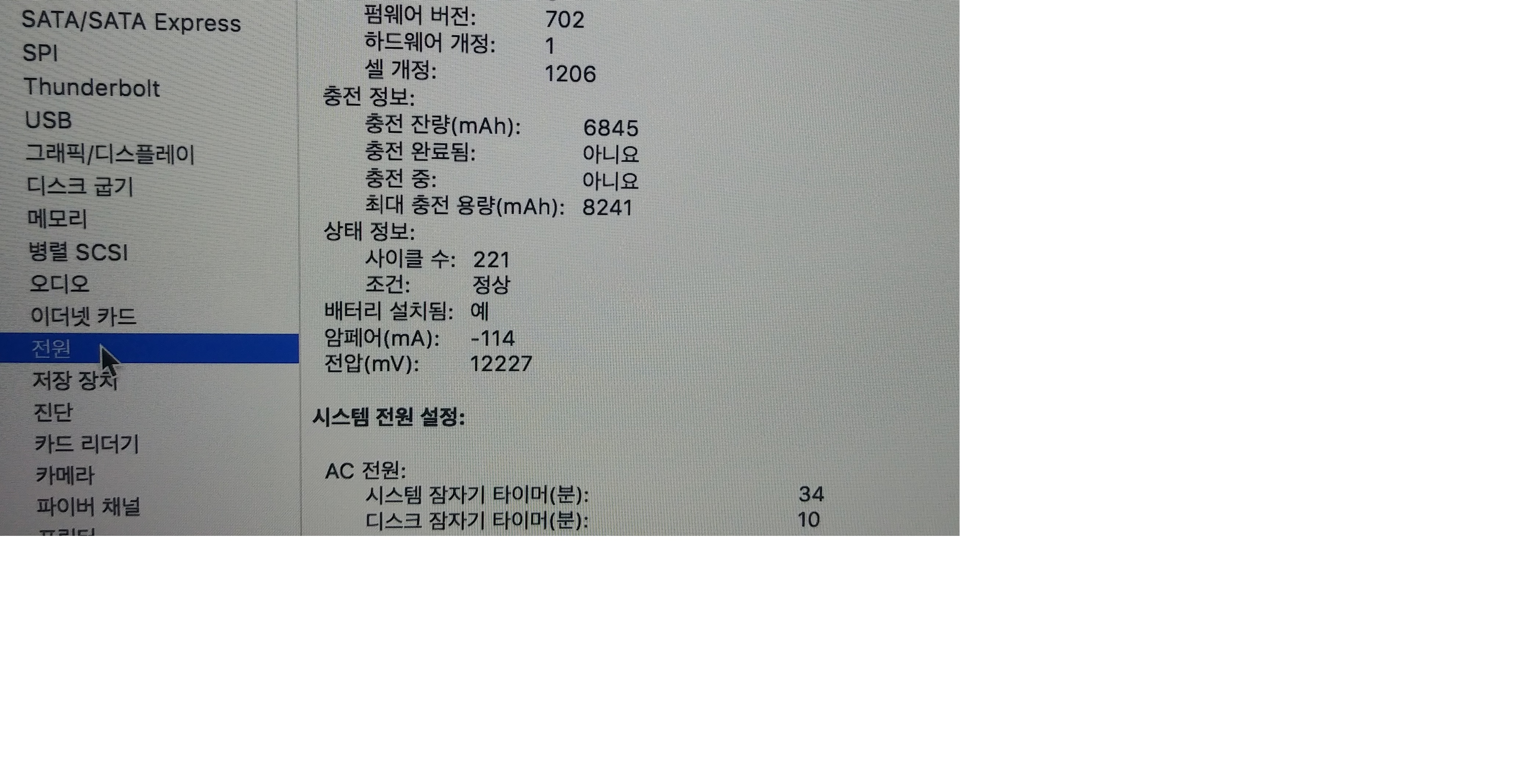 배터리 사이클 221  최대충전용량 8241