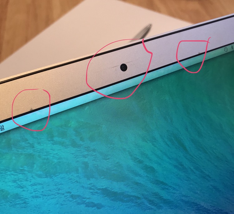 열었을 때 사진에 보시는 것처럼 화면 왼쪽 프레임에 살짝 찍힌 자국이 있습니다.