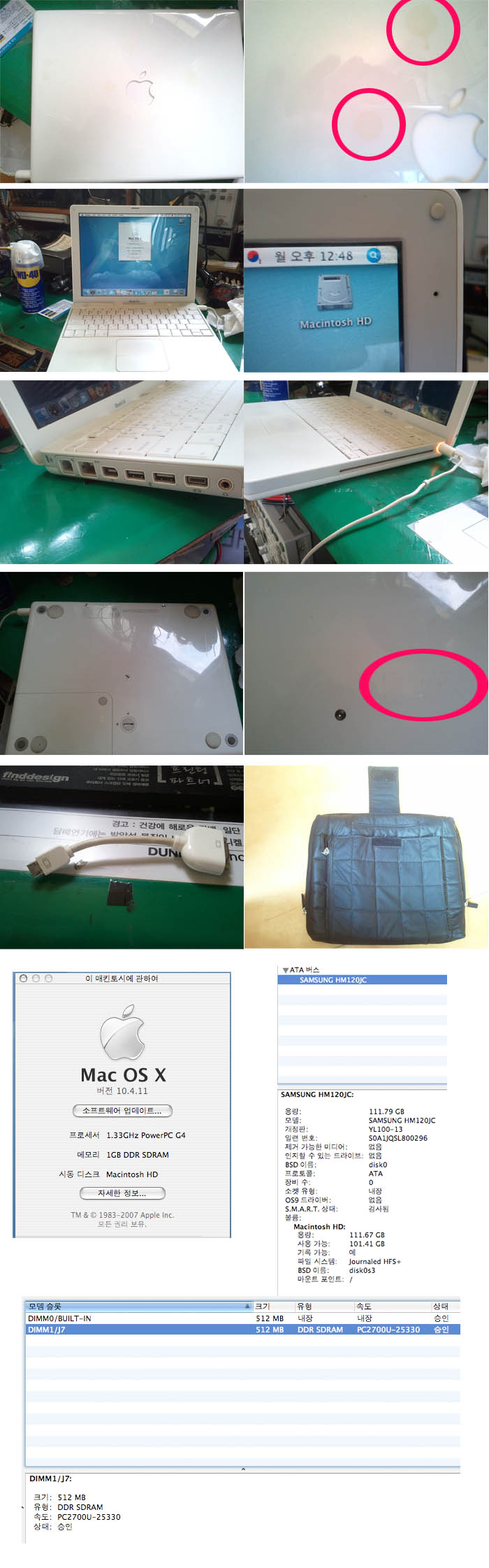 iBook G4 12인치 1.33GHz 모델 팝니다. 품번은 A1133 입니다. CPU : PowerPC G4 1.33GHz RAM : 내장 512MB, 추가 512MB ==> 1GB HDD : 120GB (기본내장 30GB 에서 삼성 120GB로 교체하였습니다. 사진 참조) ODD : SuperDrive (CD-RW/DVD combo) 그래픽 : ATI Radeon 9550 32MB LCD : 12인치 제가 두번째 주인입니다. 2007년 요맘때에 DTP를 위해 구입하였었으나 요즘에는 Quark보다 Indesign을 더 많이 쓰고 데스크탑 G4 433이 있어서 사용빈도가 적어 양도합니다. 클래식이 구동되는 모델이며(9.2 네이티브 부팅은 불가), Quark 3.3도 아주 잘 돌아갑니다. 특징이 좀 있으니 사진과 설명을 꼼꼼히 참조하세요. 1. 사진에 노란 얼룩이 있습니다. 전 주인으로 양도받으면서도 있던 얼룩인데요 뭘로 닦아도 안지워지네요. 신경안쓰고 그냥 썼습니다. 외관에 신경쓰이시는 분은 pass 바랍니다. 2. LCD에 보호필름을 붙여 놓았습니다. 원래 iBook G4 1.33의 액정이 일반 노트북보다 어두운 특징이 있는데 이 필름을 씌워놓으니 더 어두워 보입니다. 보호를 위해 걍 썼지만 신경쓰이시면 걍 떼시면 됩니다. 가장 자리 네군데에 얇은 테잎으로 붙여놓은 상태이니 떼는데는 어려움이 없습니다 3. 바닥에 명함을 붙여놓고 썼더니 잉크자국이 약간 있습니다. 잘 안지워지는데.. 그렇다고 잘 보이지도 않습니다. 4. 어댑터에 전선을 묶기위한 날개 하나가 살짝 부러진 채로 있습니다. 수리가 잘 안되더라구요. 날개가 없는건 아닌데, 약간의 유격이 있습니다. 사용하는데는 지장이 없습니다. 5. 하드웨어 적으로는 아무런 이상이 없습니다. 메모리도 1GB로 업그레이드된 상태이고, HDD도 120GB로 업그레이드된 상태입니다. 메인보드 오류도 없고, ODD도 잘 읽히며, USB/Firewire도 이상없이 인식 합니다. Quark 운용하는데 이상없이 썼고, 가끔 Call of Duty 2 같은 3D FPS게임도 구동했었드랬습니다. 6. 배터리는 외부사용이 그리 많지 않았던 관계로 2시간 이상 사용이 가능합니다. 제가 배터리상태로 2시간 이상은 써보지 않아서 잘 모르겠네요. 그정도 쓰니 60%는 남았던 것 같습니다. 실제로 만충하고 부팅하면 2시간 이상은 찍힙니다. (지금 만충하고 어댑터 빼보니 "3:59 사용가능"으로 찍히네요) 최대충전용량이 3412mAh이며 149사이클입니다. 7. 추가적으로 구입한 Mini-VGA -> VGA 젠더와 의미 없지만 파우치 겸용 가방도 드립니다. 8. 이것도 별 의미 없지만 원박스 그대로 보유중이고 OS X 10.4.2 번들과 사용설명서도 함께 있습니다. 9. 기본 상태로 포맷 및 OS설치하여 드립니다. 적고보니, 특이사항은 외관에 관한 것 뿐이네요. 몇 년 사용하면서 고장으로 수리받은 경험이 없습니다. 불과 2년전까지는 사용빈도가 좀 있었지만 Indesign을 사용하고, 파워맥 G4 데스크탑이 있다보니 빈도가 많이 줄어드네요. 거의 2년 동안 열어보고 부팅한것이 20번도 채 될까 말까였습니다. 시세가 얼마나 될지 모르겠습니다만 우선 조심스럽게 30만원에 올려봅니다. 이유있는 네고는 가능합니다만, 너무 터무니없는 네고요청은 사양합니다. 여기는 서울 북아현동(지하철 2호선 아현역 혹은 이대역)입니다. 직접 오시면 교통비 정도는 네고 하여 드립니다. 물건의 특성상 가능하면 직거래를 하였으면 합니다. 직접 만나서 외관 및 부팅상태까지 보시고 거래를 하였으면 좋겠습니다. 010-2026-5973 박상보 입니다. 감사합니다. |