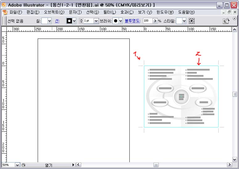 이 그림은 타 업체에서 받은 ai파일으로, 가이드라인이 이상하게 나옵니다. 안내선이 박스(2)로 나오는 것도 이상하고 네 모퉁이에 검은색으로 십자표시(1)가 나오는 것도 이상합니다.