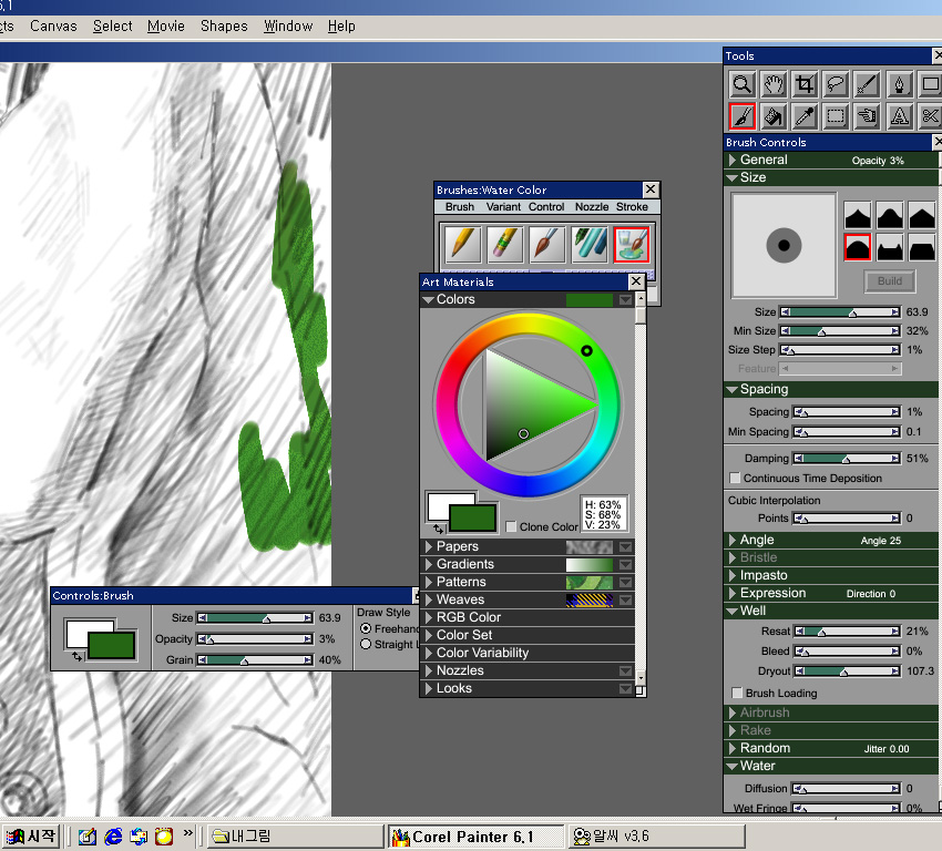이번에도 역시 심플워터에서 고해상도 화면에[300dpi 30x45cm사이즈에서..] 브러시 크기를 크게하면