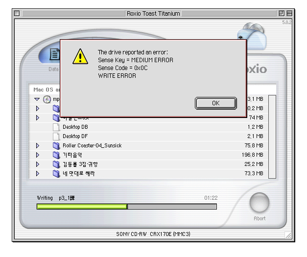 다른 설정상의 문제나 맥 OS 등의 문제라기 보다는 CD-RW 자체의 기능 저하로 인한 증상일 가능성이 큽니다.