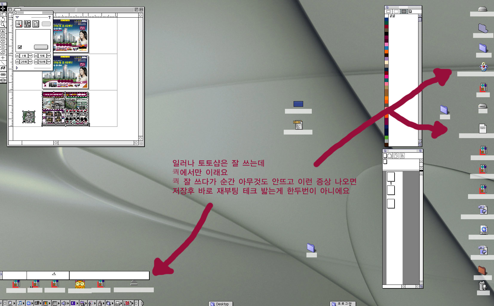 한글시스템 >Preferences폴더에서 Finder Preferences, System Preferences, MacOS Preferences, 영구램 Preferences, power Preferences(??)을 버리고 재시동을 해주세요.