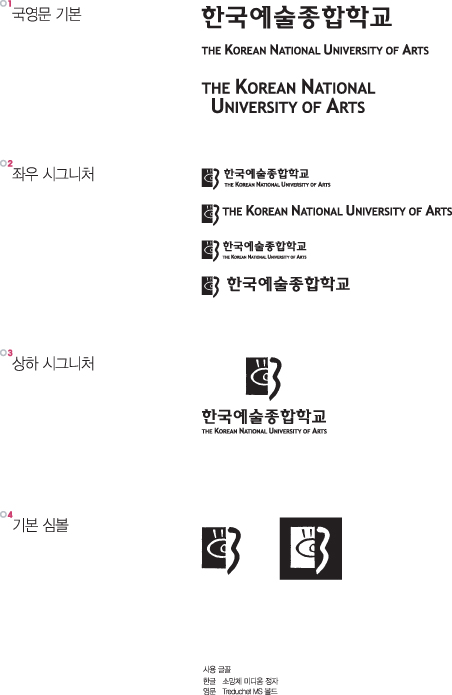 십수년이 넘어서 이렇게 매뉴얼을 펼쳐보면 누구눈에도 좀 모자라보이는 마크임이 분명합니다만 한예종이라는 학교는 이 마크를 가지고 그 십수년동안 누구에게나 제대로 읽지 않아도 아 이게 한예종이다 하고 느끼게 만들고 학교에 대해 생각하게 만드는 바로 그 비쥬얼 아이덴티티 자산을 쌓아 온 것입니다. 아이덴티티 디자인은 단순히 좋고 안좋고 또는 로고타입이 타이포그래피적으로, 편집디자인적으로 맞아떨어지고 틀리고 하는 것으로는 좋은 디자인인지 아닌지 판단할 수 없습니다.