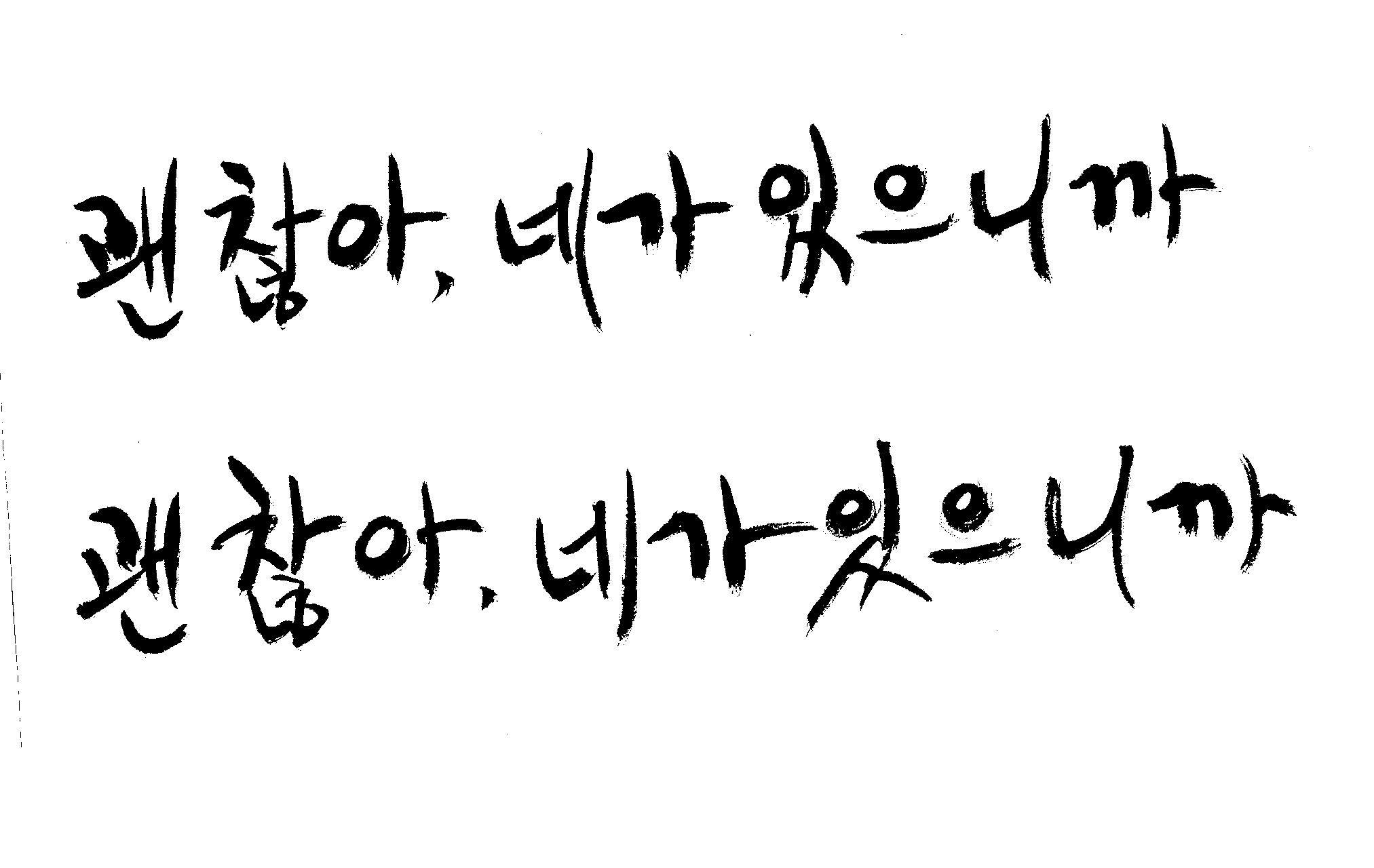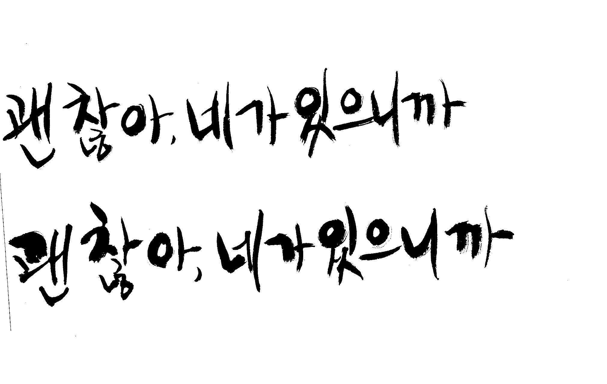 캘리 하나 부탁드릴께요. 김철호 일반 0 6895 2009.01.06 22:48 > > > > > 지금 작업중인 표지가있는데 > > > > 손글씨로 한번 작업해보려구요 > > > > 부탁드립니다. > > > > 괜 찮아, 네가 있으니까 > > >